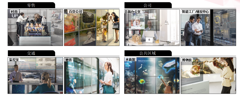此外,OLED柔性拼接屏在平面的显示领域同样具备极大的优势,OLED前所未有的3.5mm拼缝,屏体的厚度仅仅为1mm,同时这也是让当下几大主流显示产品都望尘莫及的。这使得在追求创意的商显和展览展示空间领域,柔性拼接屏的应用最为广泛,比如:在垂直方向、横行乃至一些弧度的显示设计。同时亦可实现超轻薄拼接墙体设计等这些现有拼接技术难以实现的差异化应用。随着OLED技术日趋成熟,未来OLED有望实现与液晶媲美的拼缝。