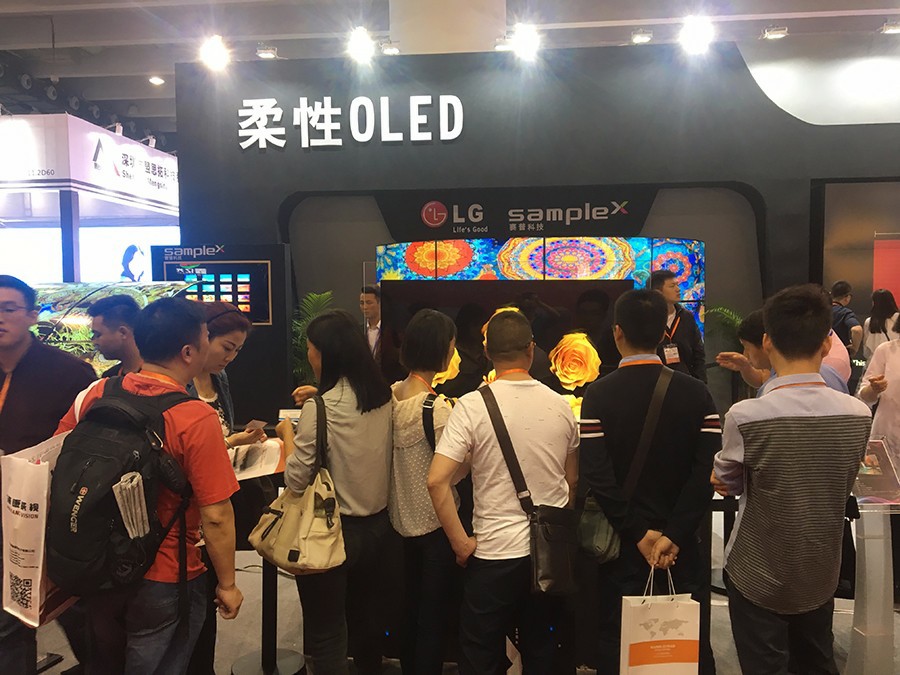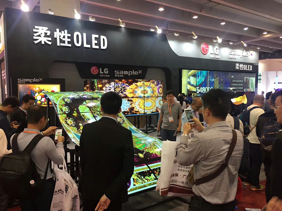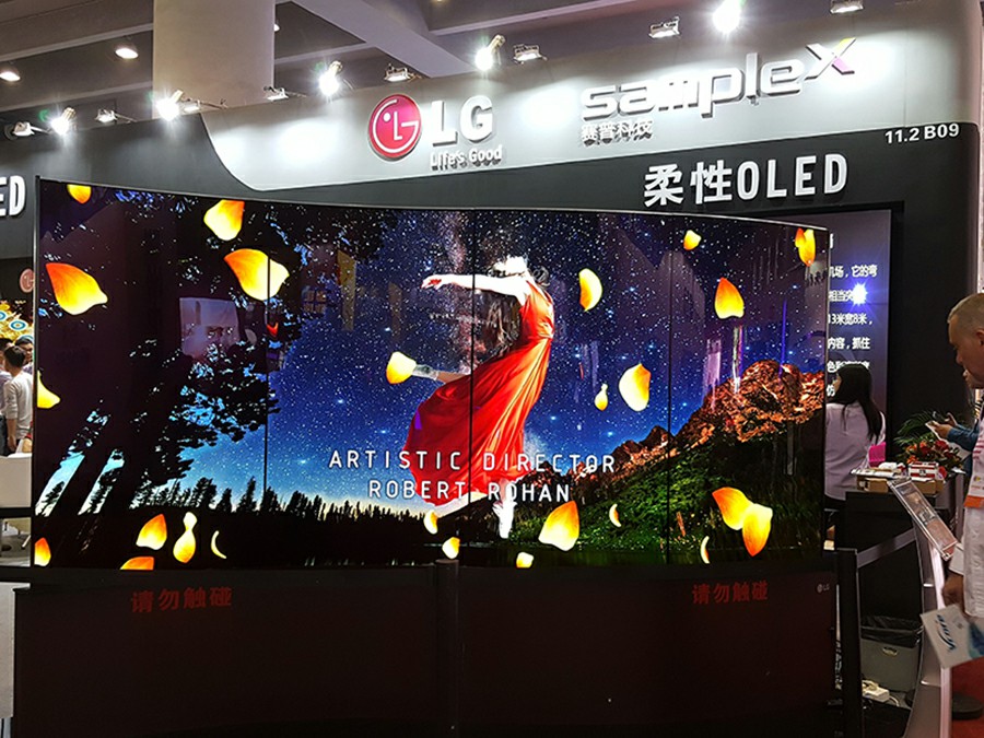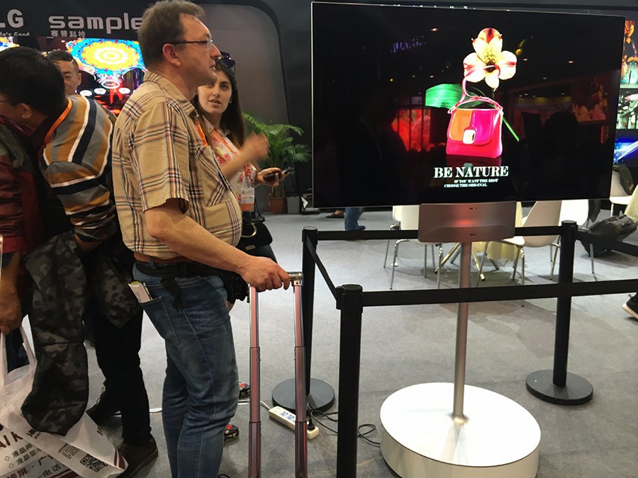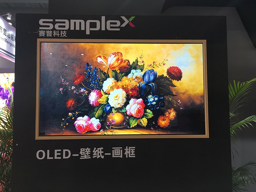 OLED毫米级的屏幕厚度,在商用显示业界可以说堪比壁纸。现场展出的一块玻璃壁纸屏就是将OLED屏镶贴在玻璃上,同时也可以达到双面显示的效果。使整屏达到极致轻薄美观,在高端零售、购物中心、会议中心等领域有着极为可观的应用前景。