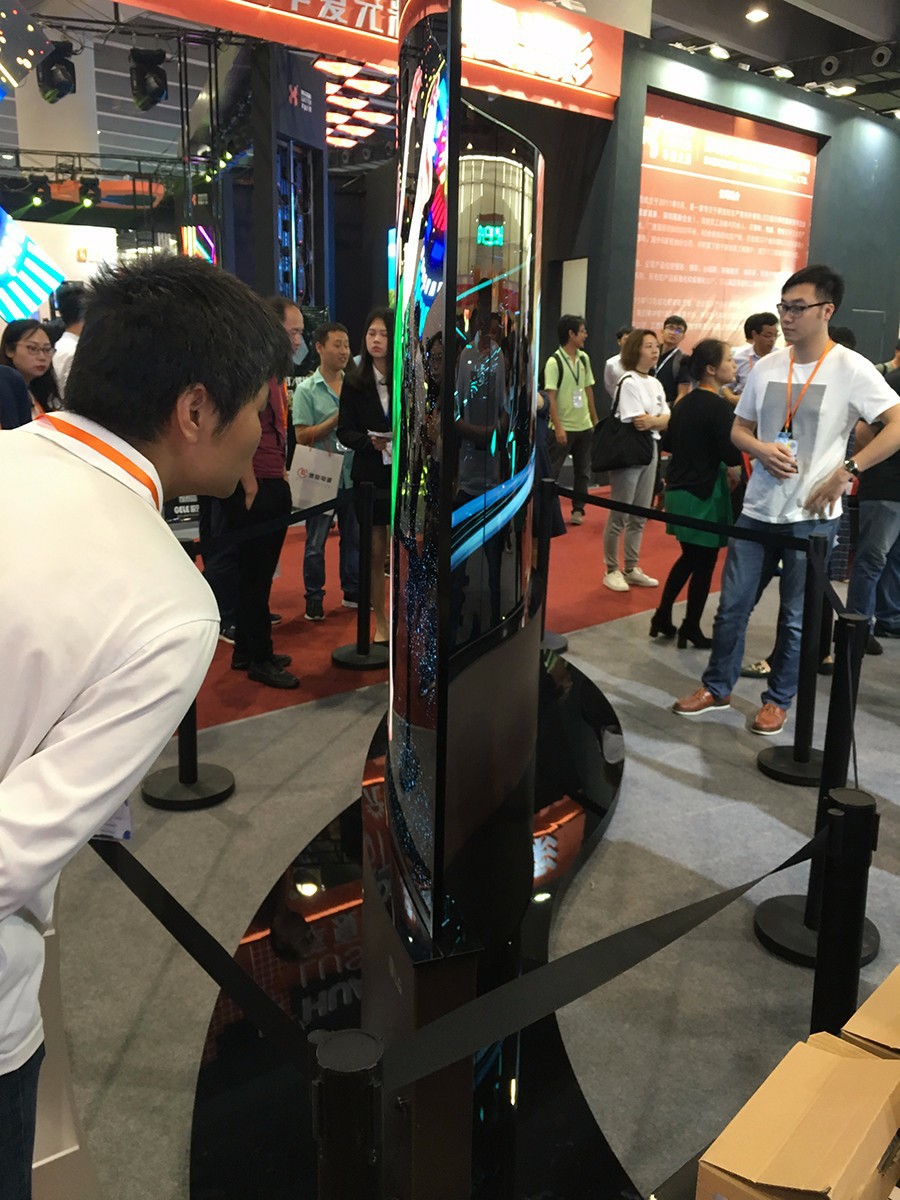 走进304AM永利科技展台,首先映入眼帘的是绚丽夺目的65寸双面曲面波纹拼接标牌显示器,其完美出色的画质和革命性的纤薄设计,为显示功能大大增添了艺术价值。这款双曲面拼接是由8块65寸曲面屏拼接而成,单块65寸显示器分辨率就达到了4K,也就是说整个显示器的分辨率高达32K,360°观看角度无死角,是整个展位的点睛之笔。