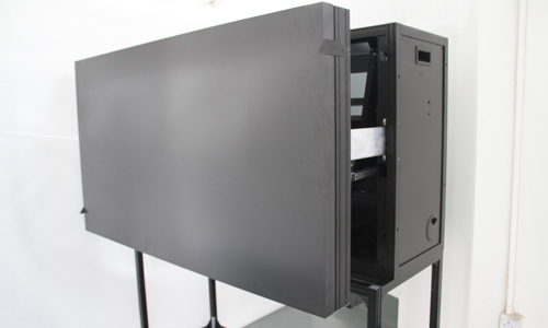 它还有一个令人叫绝的技术,通过采用先进的液压传动技术,可以快速高效实现前 维护,并支持三层以上堆叠。由于这款箱体不再需要后部维修通道(目前市面上主流的平板拼接,无论是LCD拼接还是PDP拼接,都需要一定的后部维修通道),单元整体厚度十分接近主流LCD、PDP等平板拼接(含支架及后部维修通道)的尺寸。通过采用这些最新的技术手段,传统的DLP拼接单元完全实现了脱胎换骨,从而彻底颠覆了人们对传统DLP拼接单元的认知。许多在现场观察过实物的用户一不留神,就会把它误解成为大屏幕平板拼接产品。