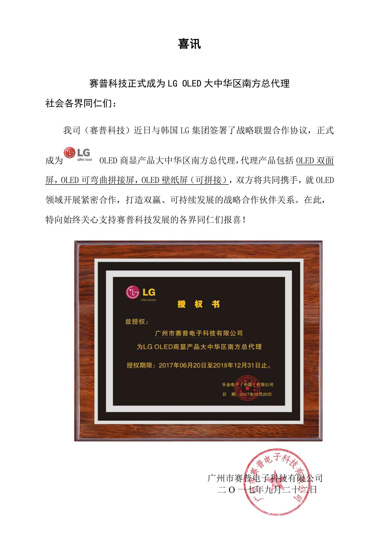 社会各界同仁们: 我司(304AM永利科技)近日与韩国LG集团签署了战略联盟合作协议,正式成为 OLED商显产品大中华区南方总代理