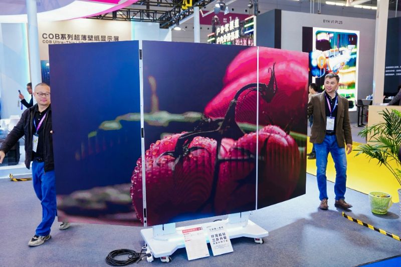 这款一体机采用创新三折叠设计,结构精巧紧凑,兼具高强度与轻量化优势,运输、安装、拆卸全程高效便捷,无需复杂施工,可快速部署于临时展会、高端会议、移动指挥、商业展演等多种场景。同时,产品搭载P1.2微间距COB显示技术,画质清晰细腻、无缝拼接,兼顾极致轻薄与卓越显示性能,将便携性与专业性完美融合,为大屏显示的场景化应用开辟了全新思路,推动显示设备从固定安装向灵活移动、快速部署升级。